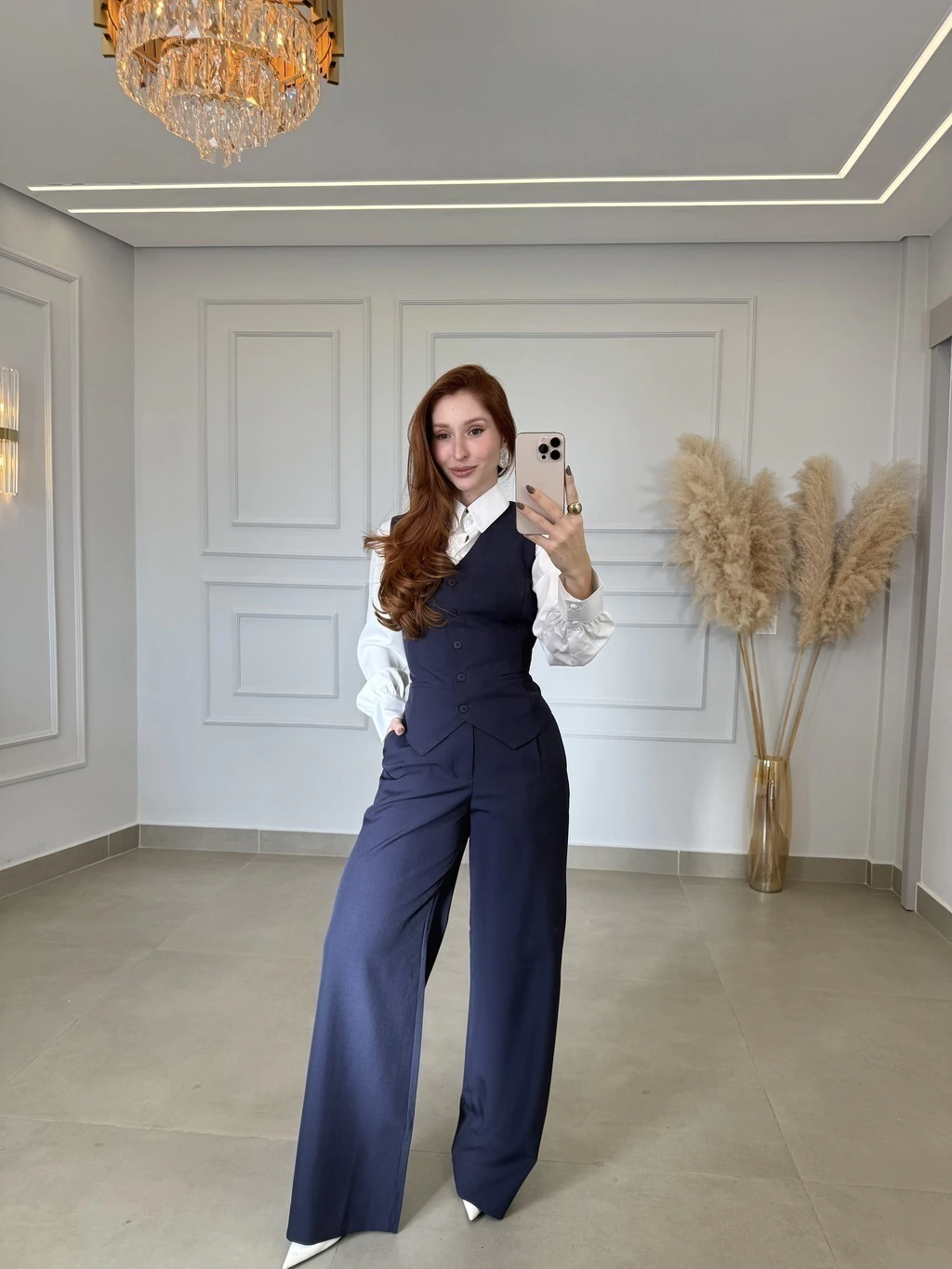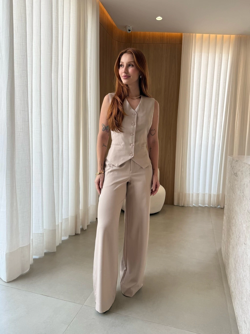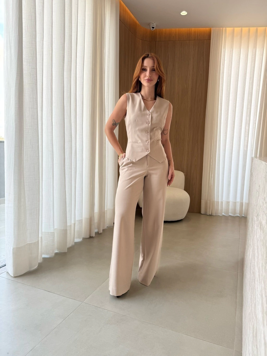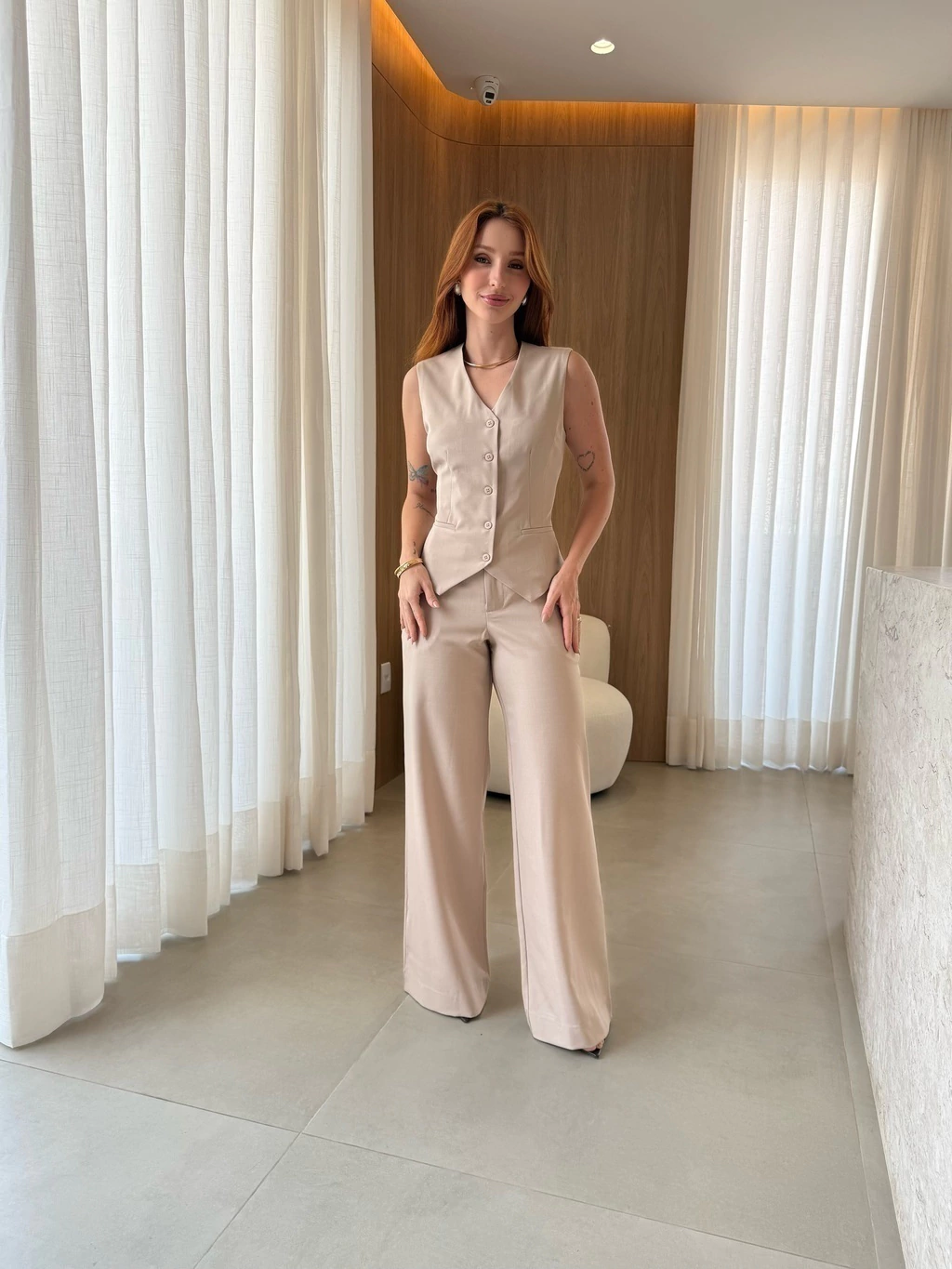O colete, com seu design sofisticado, acentua a silhueta de forma delicada, enquanto a calça aporta um caimento fluido e moderno. Ideal para diversas ocasiões, o Conjunto Mafê promete ser um destaque em seu guarda-roupa.