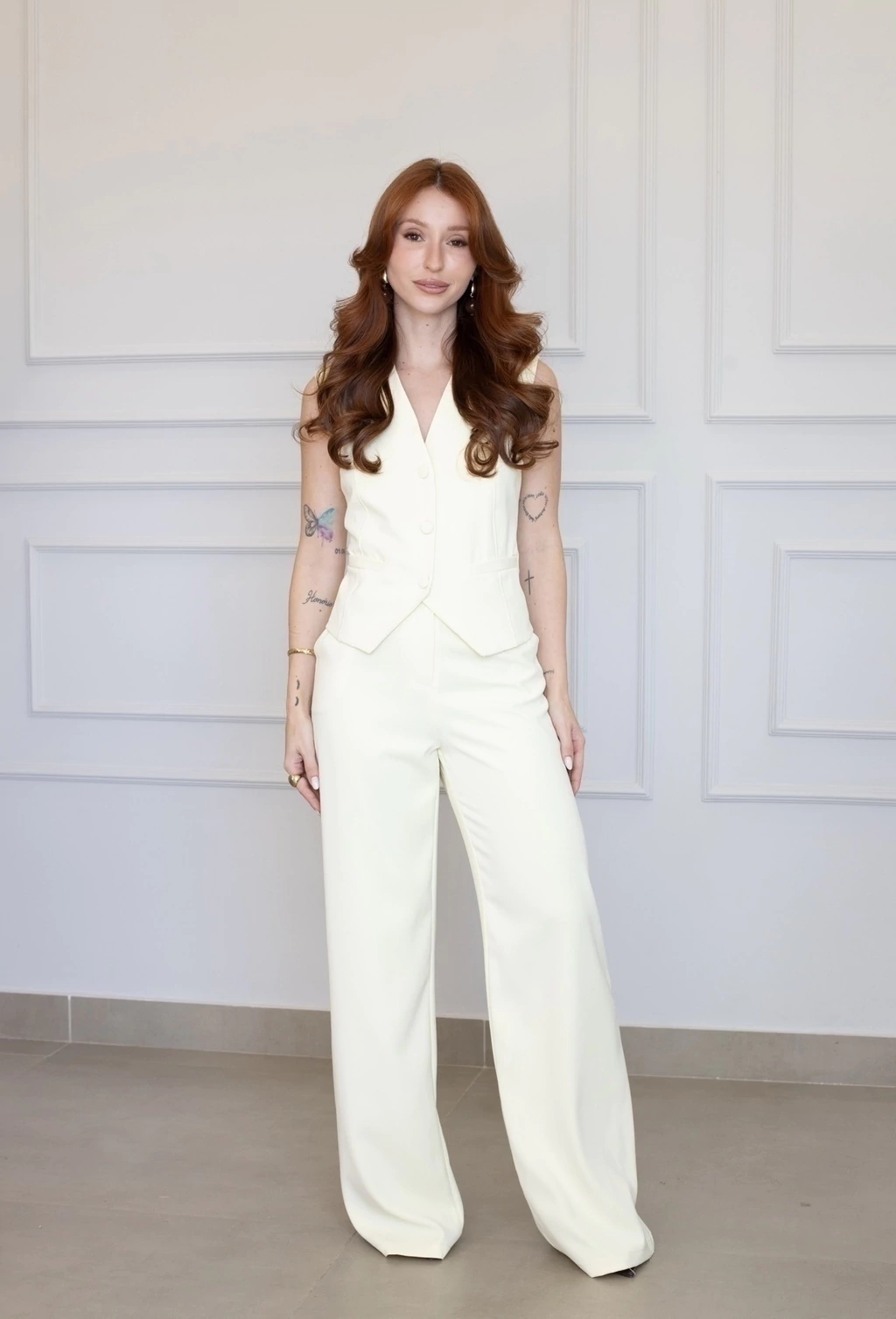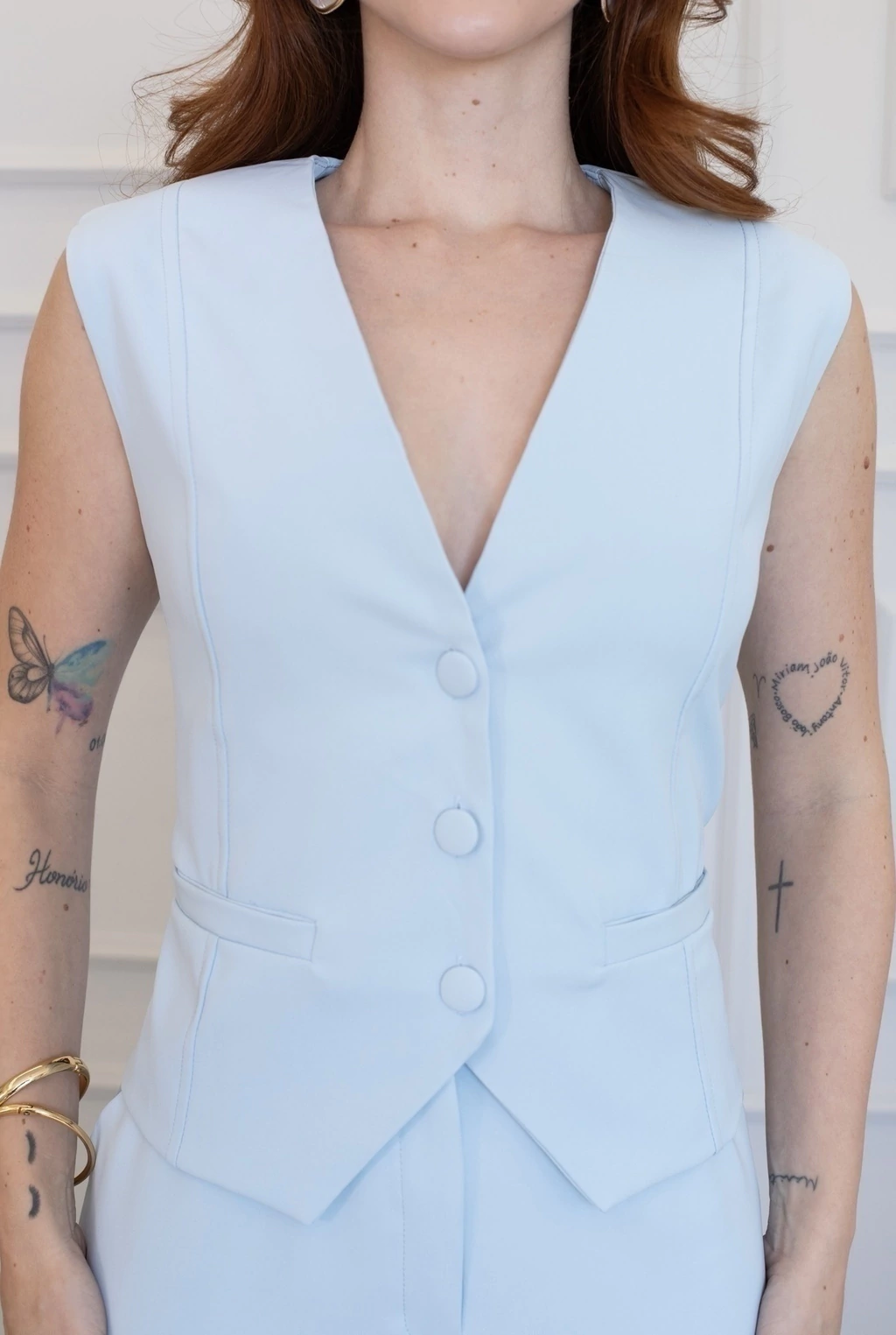 As peças contam com botões encapados que adicionam um charme discreto, enquanto sua versatilidade permite criar diversas combinações, ideal para um armário cápsula funcional e elegante. Você pode usar as peças juntas ou separadamente, adaptando seu look para diferentes ocasiões, do escritório a eventos sociais.