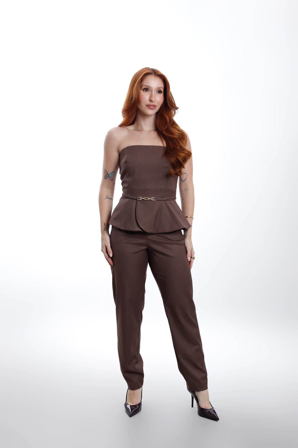 Descubra o Conjunto Zafira, uma peça de alfaiataria extremamente estruturada que é a definição de sofisticação e modernidade. Na sofisticada cor marrom, este conjunto é ideal para todas as estações, oferecendo uma base neutra que combina com tudo.