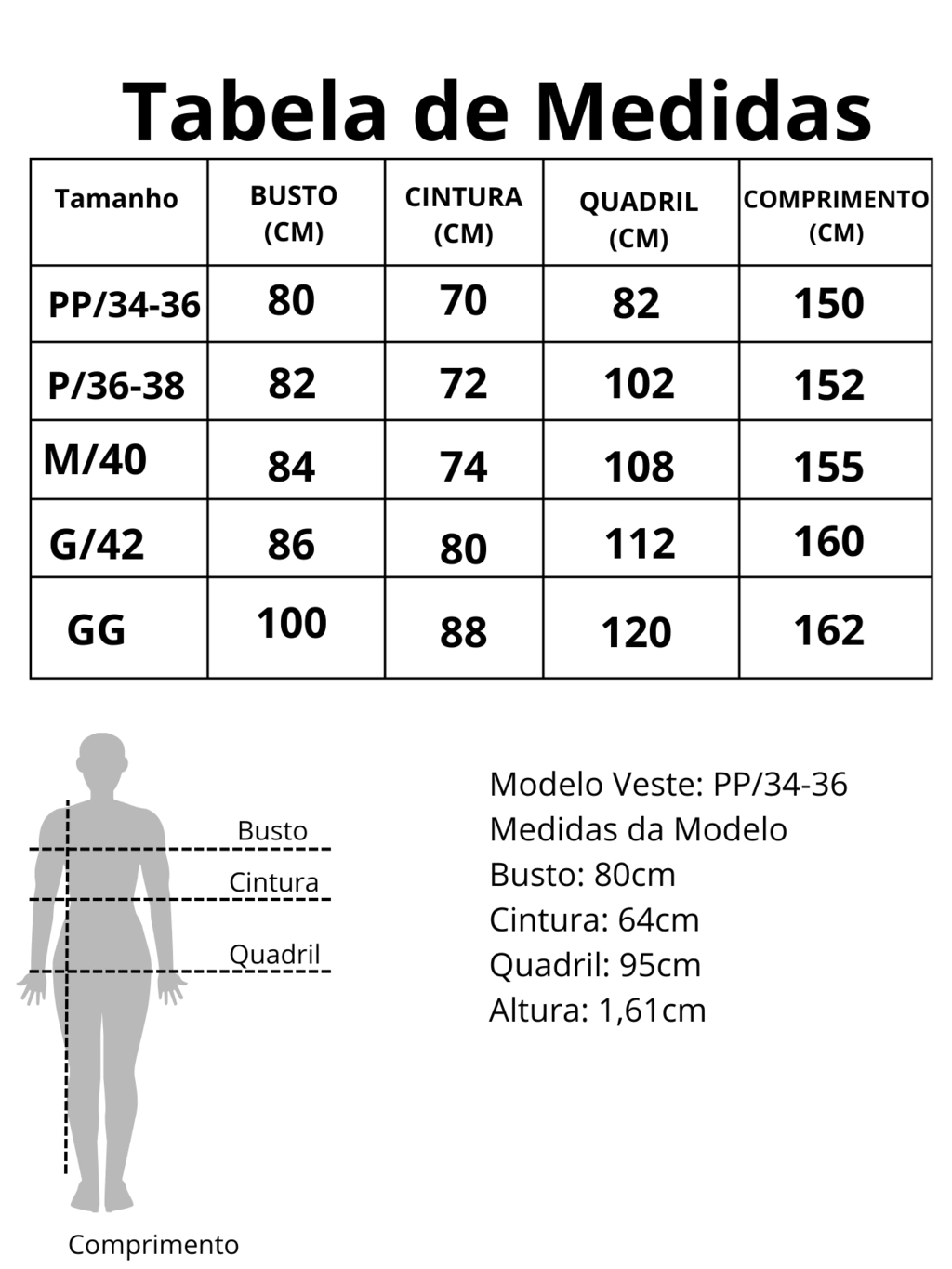 M: 40 Busto: 84cm; Cintura: 74cm; Quadril: 108cm; Comprimento: 155cm