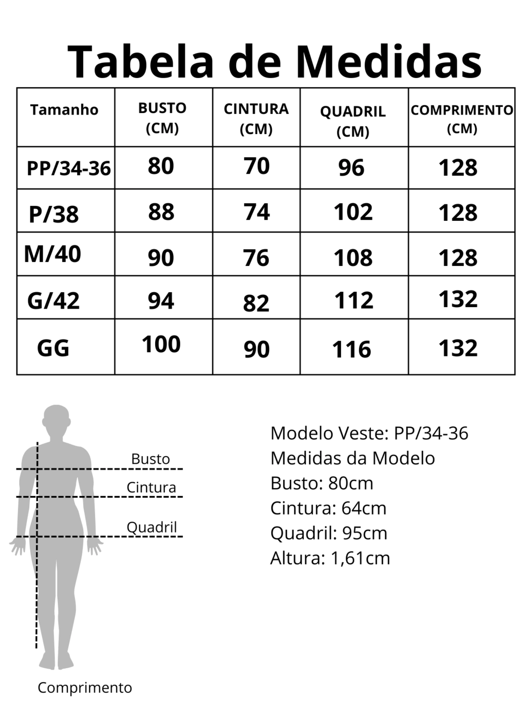 M: 40 Busto: 90cm; Cintura: 76cm; Quadril: 108cm; Comprimento: 130cm; Gola 20cm; Manga 63cm